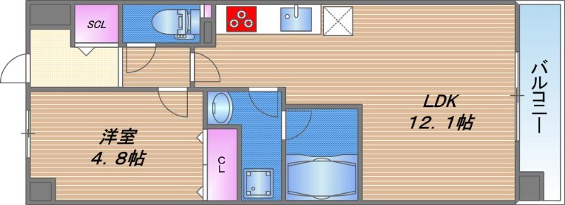 間取り1LDK [ LDK12.1帖、洋4.8帖 ]