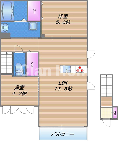 | 間取り | 2LDK [ LDK13.3帖、洋5帖、洋4.3帖 ] 55m2 |