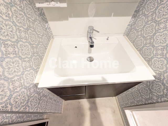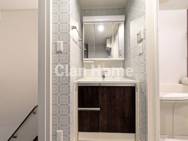 独立した洗面脱衣所があり、シャンプードレッサー(三面鏡付の洗面台)と室内洗濯機置き場がスマートに配置されています。脱衣スペースにゆとりがあるため、朝の身支度もストレスなく行えます。