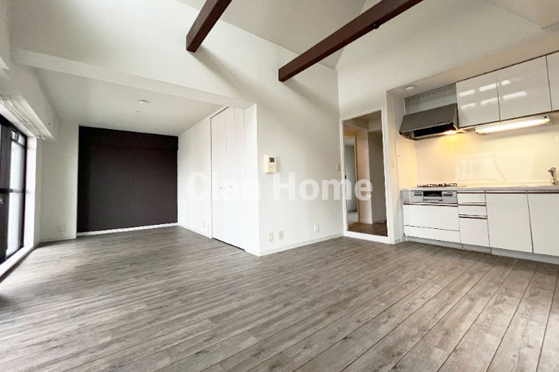 室内は、16.4帖もの圧倒的な広さを誇るLDK。木の温かみが感じられるフローリングが、落ち着いた上質な雰囲気を演出します。家族が自然と集まる開放的なリビングは、お好みの家具を自由に配置してもゆとりたっぷりの空間です。