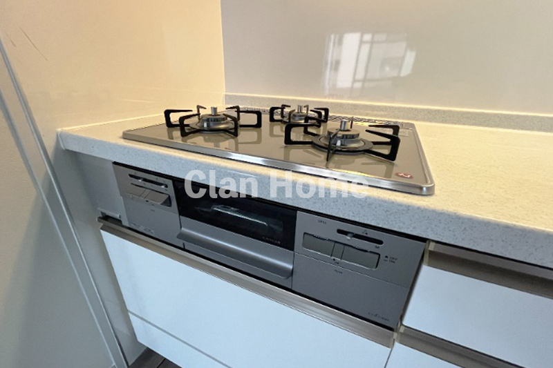 3口コンロとグリルを備えた本格的なシステムキッチン仕様で、複数の料理も効率よくこなせます。また、手元が隠れるカウンタータイプなので、急な来客時も生活感を出さず、常にスタイリッシュな空間を保てるのが嬉しいポイント。16.4帖の大空間を贅沢に感じながら、毎日の食事作りがもっと楽しく、クリエイティブな時間に変わります。